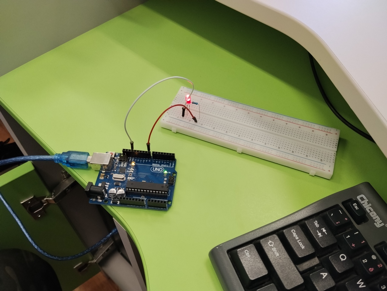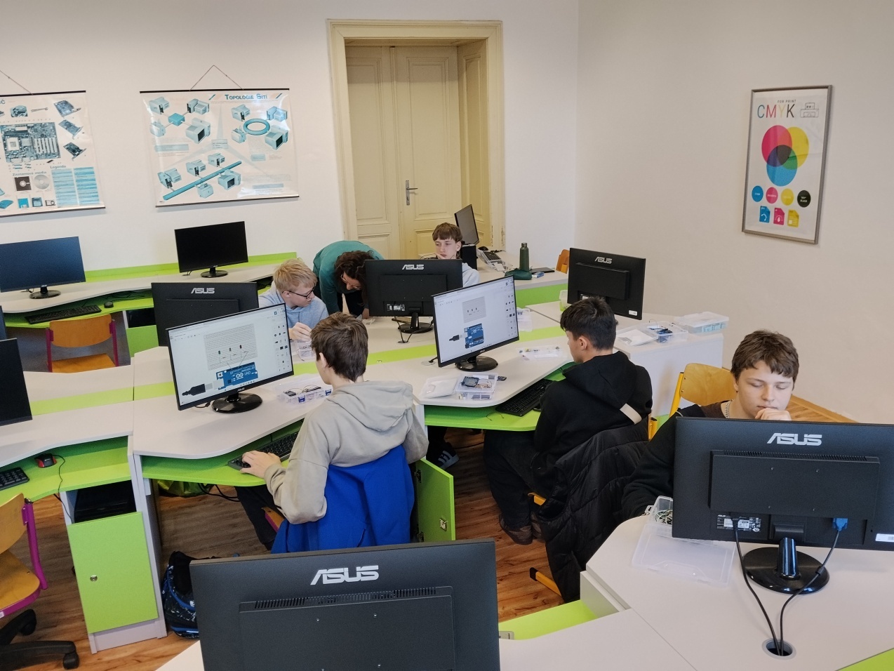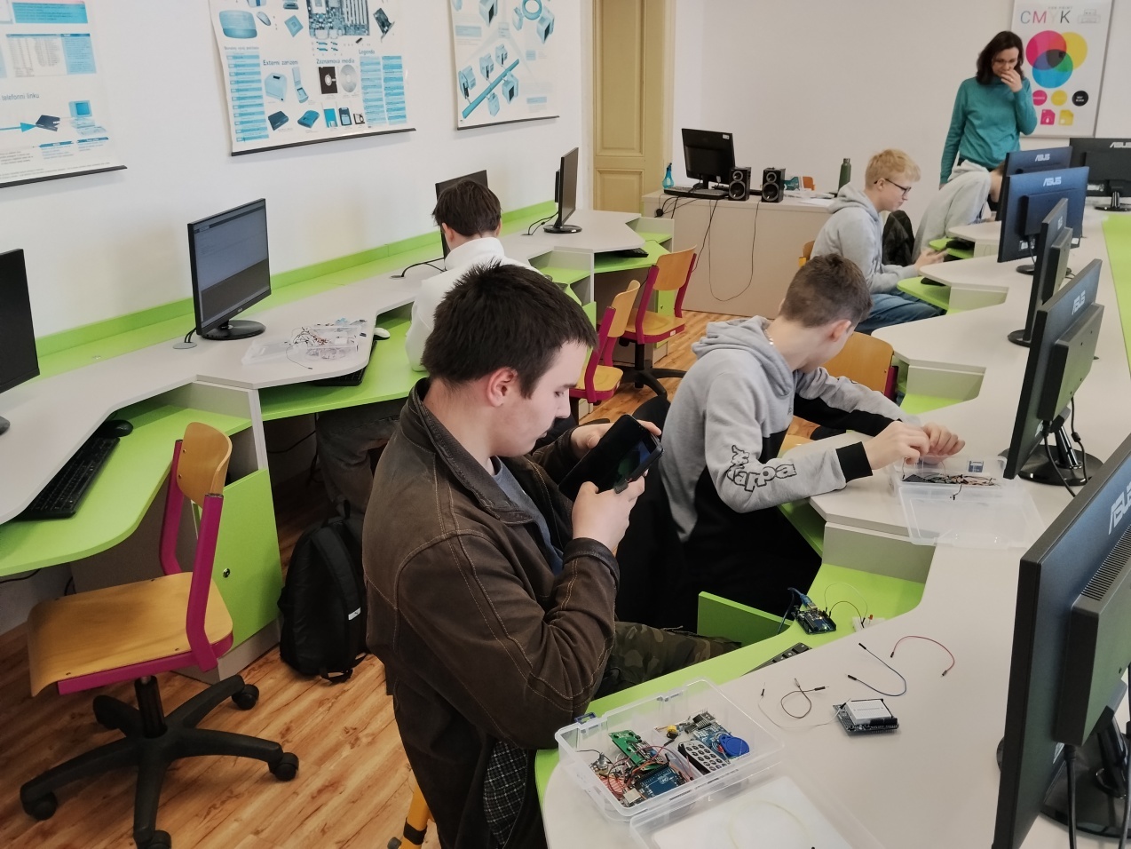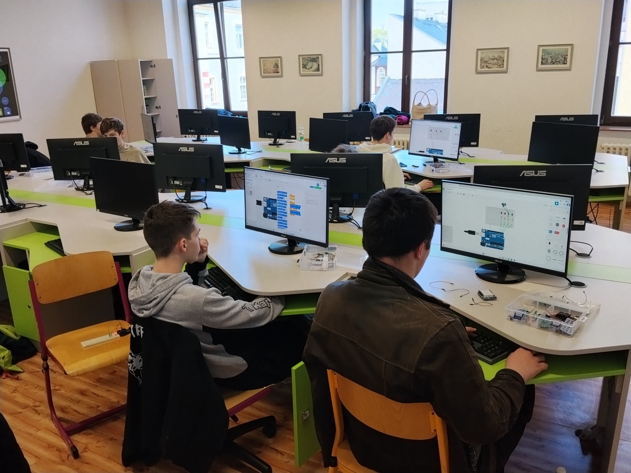 Během workshopu si žáci vyzkoušeli základní zapojování elektronických součástek, práci s mikrokontrolérem a jednoduché programování. Prakticky realizovali například blikající LED diody, model semaforu a zapojení bzučáku, čímž si osvojili principy řízení elektronických obvodů. Akce probíhala v příjemné atmosféře a žáci hodnotili workshop velmi pozitivně – ocenili především možnost si vše sami vyzkoušet.